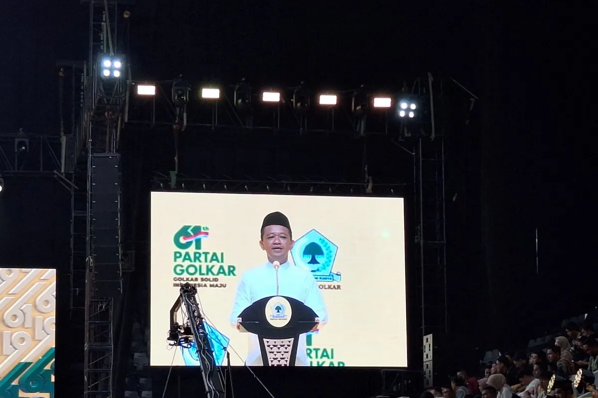 Ketua Umum Partai Golkar Bahlil Lahadalia berikan sambutan dalam doa bersama Perayaan Puncak HUT ke-61 Golkar di Istora Senayan, Jakarta, Jumat (5/12/2025). ANTARA/Fianda Sjofjan Rassat