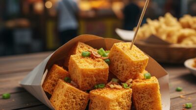 Setelah melanglang buana ke Korea dan Jepang, kita kembali mendarat mulus ke jajanan asli Indonesia yang legendaris: Tahu Krispi Fatmawati! Ini adalah penyeimbang yang sempurna. Tahu yang digoreng garing hingga berongga ini selalu dicari. Keunggulannya terletak pada kegaringan yang tahan lama dan varian bumbu non-stop yang bisa dipilih, mulai dari Keju, Balado, hingga Pedas Gurih.