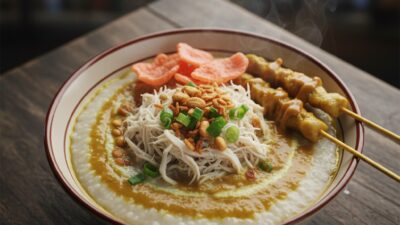 Sebagai penutup petualangan rasa yang seru, saatnya mencari yang hangat dan mengenyangkan: Bubur Cirebon. Bubur ini menyajikan sensasi comfort food khas Nusantara. Dengan kuah kuning kental yang gurih, taburan ayam suwir, kacang, dan kerupuk, Bubur Cirebon menjadi ending yang sempurna setelah mencicipi snack dari berbagai negara.