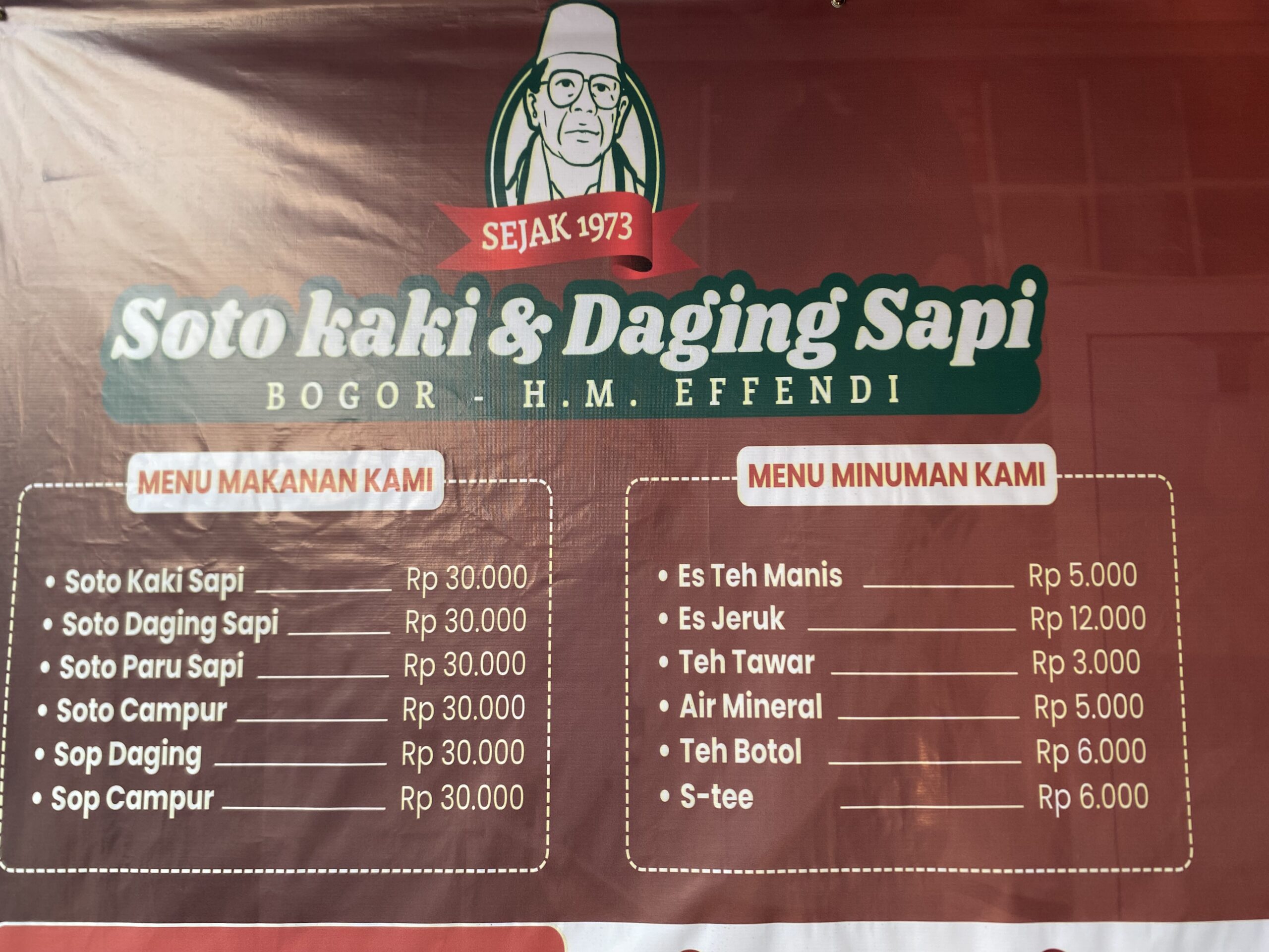 • Pilihan Menu: Tersedia menu utama seperti Soto Kaki, Soto Daging, Soto Paru, dan Soto Campur dengan pilihan kuah santan atau kuah bening.