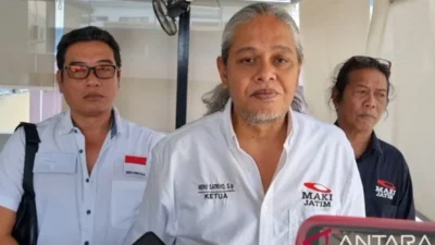 Ketua Masyarakat Anti Korupsi (MAKI) Jatim, Heru Satriyo saat ditemui di halaman Ditreskrimsus Polda Jatim,…