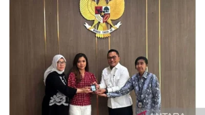 Wartawan CNN Indonesia Diana Valencia (tengah) menerima kembali kartu identitas (ID) liputan Istana usai pertemuan…