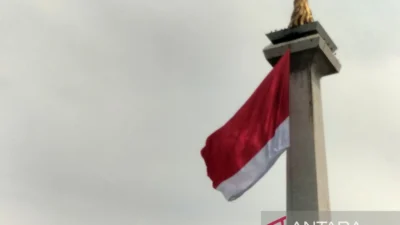 Ilustrasi – Bendera merah putih terbentang di Monas saat gladi bersih perayaan HUT Ke-80 TNI…
